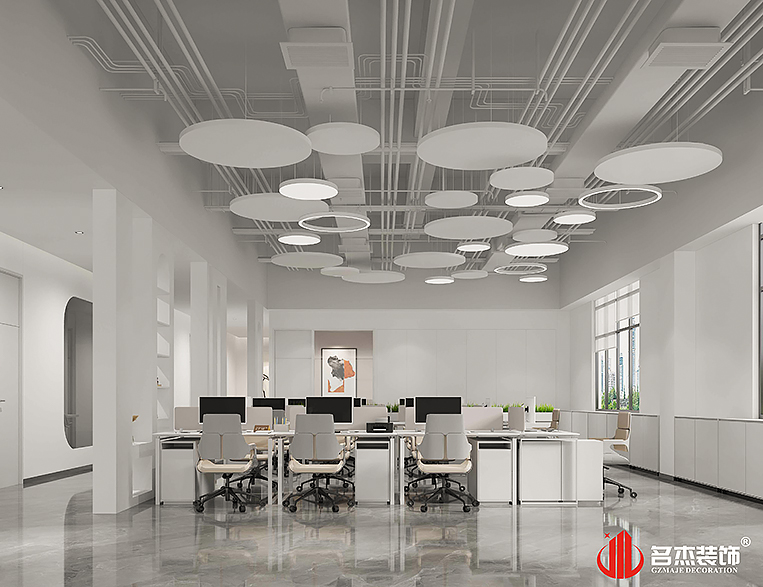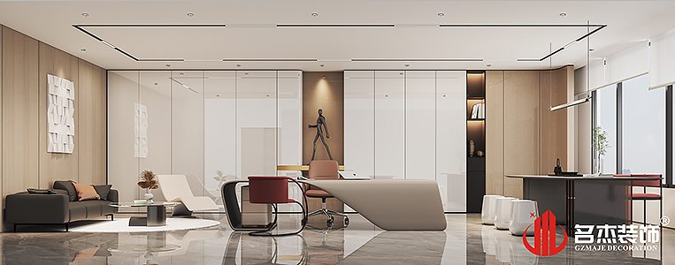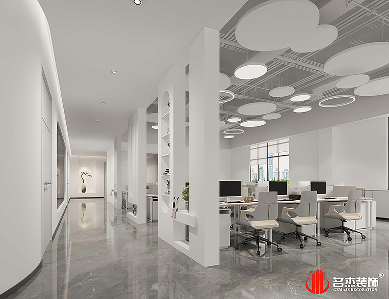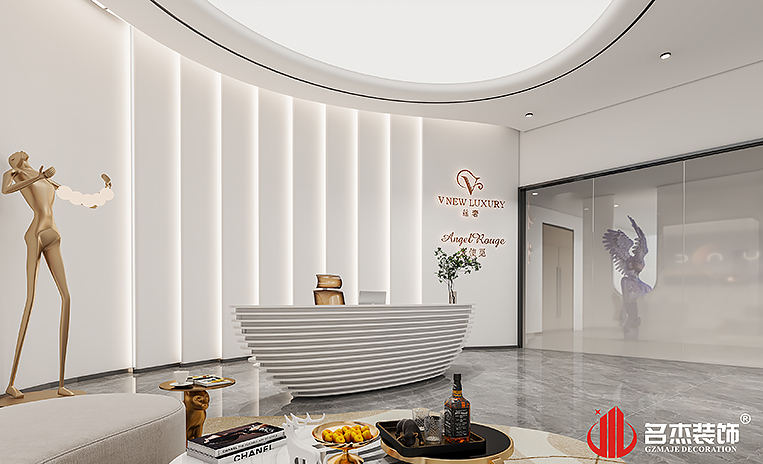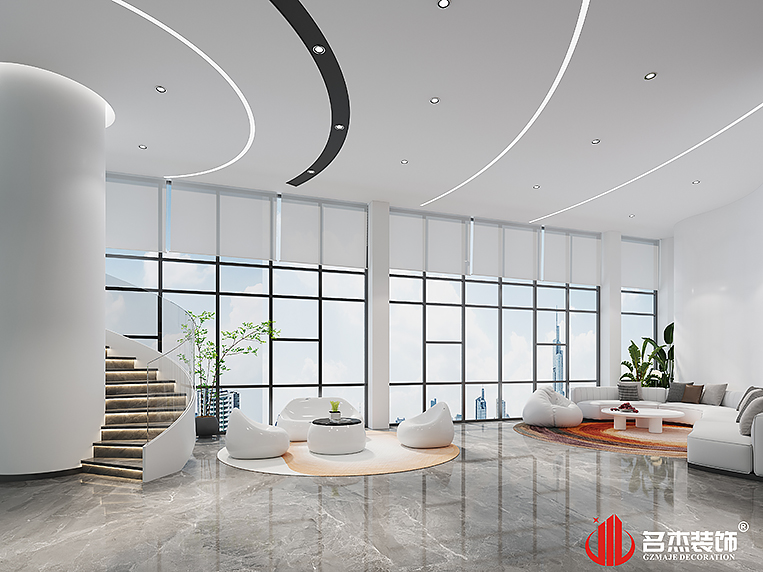 整體辦公裝修設計空間的設計格調是時尚輕奢的風格,在前臺區域使用的是層疊的手法,加上大圓弧的吊頂,讓空間的層次感一下子就出來了。燈帶的加入也讓這個區域變得更加有時尚設計感。辦公裝修設計空間大量使用圓弧的元素,加以燈帶的組合搭配,也讓各個空間形成一種呼應。