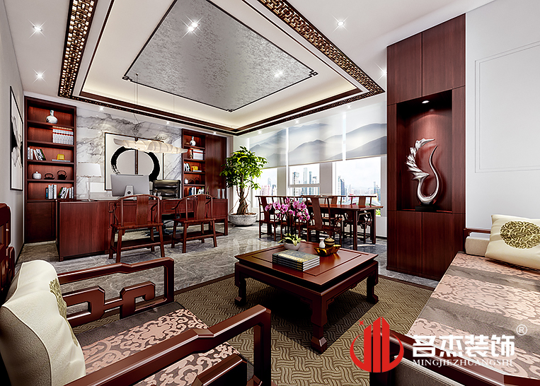 在本案例中設計師充分利用了來自窗外的自然光線,為辦公室賦予靈動的生命力,由于主營業務是為企業客戶和社會中上階層,故整體設計以現代簡約和現代中式為主,美麗大方,空間感藝術感俱佳。設計布局規整,中軸對稱設計體現出大公司獨有的作風與魄力,空間設計打破傳統辦公設計,以玫瑰金,大理石為主,通過各種創新的方法運用不但拉近了人與人之間的距離,也更享受多功能化、智能化和人性化模式。