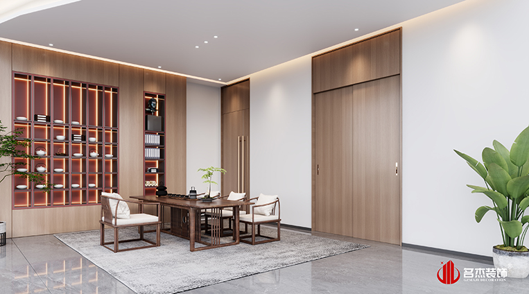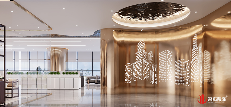 整個辦公空間使用土豪金的配色作為主調色,加入土豪金配色能夠讓辦公室裝修設計空間變得更有奢華的感覺,更能夠體現出新能源這個行業的發展是非常有前景的。前臺區域使用鋁材沖孔板作為背景墻,加入土豪金的顏色,一下子就能夠讓人感受到這個空間奢華感。在茶室區域使用弧形玻璃,搭配有造型的天花,設計感一下子就出來了。
