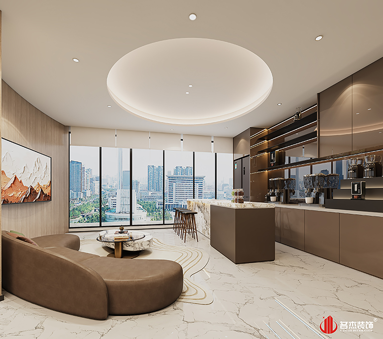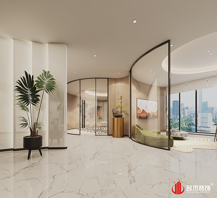 整體辦公室裝修設計空間是采用時尚簡約風格作為主題風格的,但設計團隊根據該企業的科技行業屬性,加入曲線這個設計元素來作為點綴,搭配米白色系,空間的設計層次感就非常明顯了。適當加入弧線燈帶也是能夠讓單調的天花吊頂有了不一樣的設計表達方式,增加整體辦公室裝修設計空間的設計感。#廣州辦公室裝修設計公司#